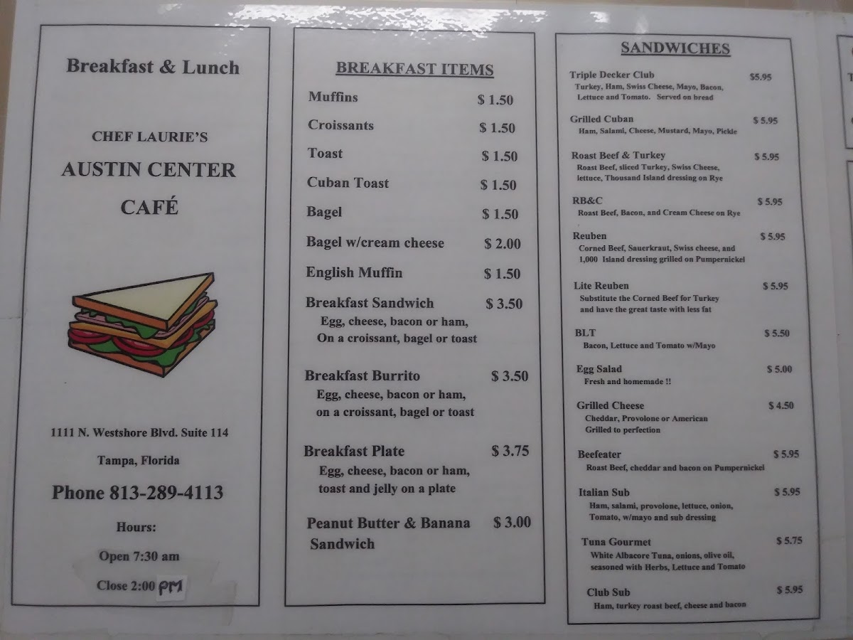 At Austin Center Cafe Menu, you’ll find a delightful mix of flavors that cater to every taste. Whether you're in the mood for a savory breakfast or a refreshing salad, this spot has something to please everyone. The menu offers a great selection of sandwiches, hearty entrees, and freshly brewed coffee, making it the perfect place to grab a bite with friends or for a quick lunch. Their diverse offerings include classic comfort foods, as well as more creative dishes for those looking to try something new. No matter what you’re craving, you’ll be met with delicious, satisfying choices.